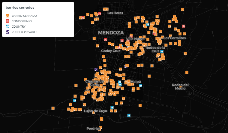 Edición UNCuyo desarrolló un informe sobre el crecimiento de las urbanizaciones privadas en el Gran Mendoza en los últimos años, esta información data del 2015, y no parece haber sido actualizada. De todos modos los datos relevados detallan que el 60% de las urbanizaciones cerradas se construyeron desde 2004 y continúan en crecimiento.